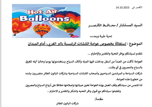وقال أصحاب شركات البالون الطائر في استغاثتهم لمحافظ الأقصر: لذا نلتمس من سيادتكم وقف العمل بهذه العوامة لحين صيانتها وإصلاحها حفاظا على أرواح السياح والمصريين.