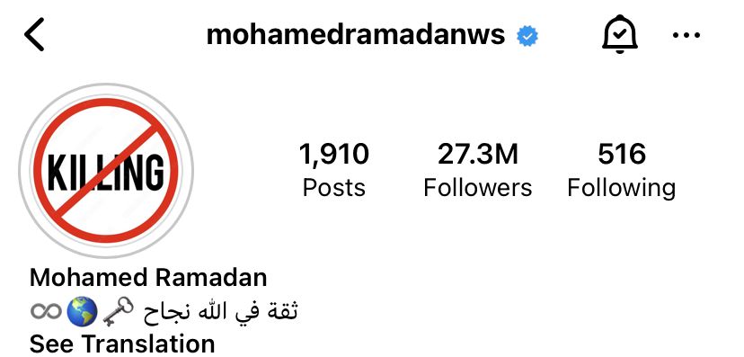 قرر الفنان محمد رمضان، تغيير صورته الشخصية لـ الصحفة الرسمية له عبر موقع إنستجرام لصورة مكتوب عليها لا للقتل، وذلك تضامنا مع دولة فلسطين في حربها ضد إسرائيل.