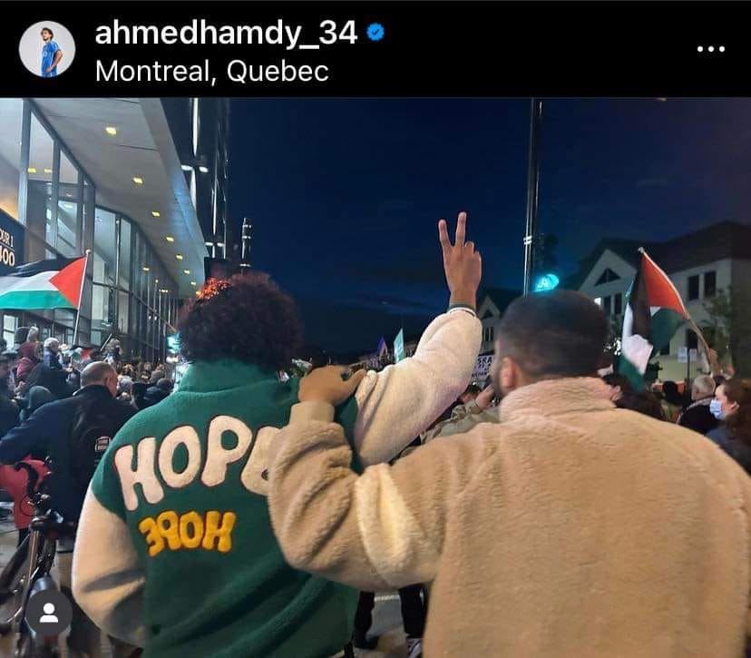 حرص أحمد حمدي لاعب منتخب مصر ومونتريال الكندي، ولاعب الأهلي السابق، على المشاركة في وقفة تضامنية مع أهالي فلسطين، والتي أُقيمت في منطقة مونتريال في كندا.