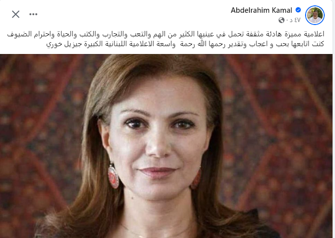 من جانبه، حرص السيناريست عبد الرحيم كمال على نعي الراحلة جيزال خوري، إذ كتب عبر حسابه الشخصي بموقع التواصل الاجتماعي، فيس بوك: إعلامية مميزة هادئة مثقفة، تحمل في عينيها الكثير من الهم والتعب، والتجارب والكُتب والحياة، واحترام الضيوف، كنت أتابعها بحب وإعجاب وتقدير، رحمها الله رحمة واسعة، الإعلامية اللبنانية الكبيرة جيزال خوري.