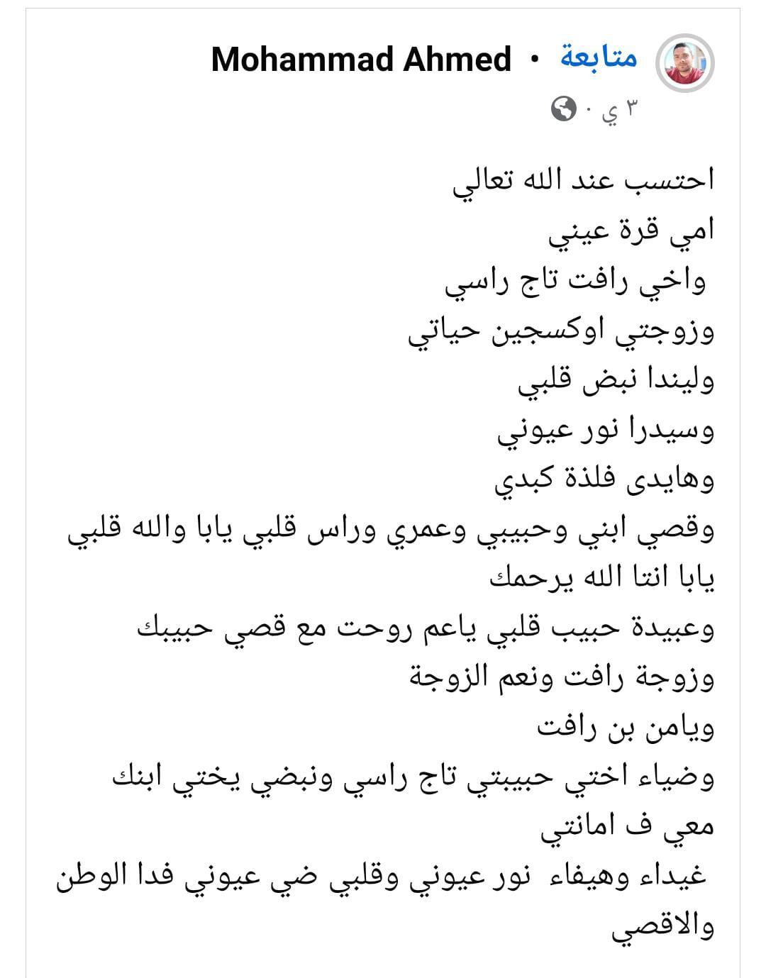 وأضاف محمد في المنشور المؤثر الذي تداوله مستخدمو موقع فيسبوك على نطاق واسع: وقصي ابني وحبيبي وعمري وراس قلبي يابا انت الله يرحمك، وعبيدة روحت مع قصي حبيبك، ويامن بن رأفت، وضياء اختي حبيبتي ابنك معي في أمانتي، وغيداء وهيفاء فدا الوطن والأقصى.