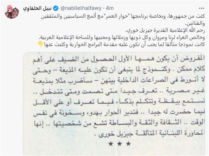 وكتب الفنان نبيل الحلفاوي، ناعيًا الإعلامية جيزال خوري: كنت من جمهورها وبخاصة برنامجها "حوار العمر" مع ألمع السياسيين والمثقفين والفنانين.. رحم الله الإعلامية القديرة جيزيل خوري، وخالص العزاء لرنا ومروان وكل ذويها وزملائها ومحبيها وللساحة الإعلامية العربية.. كانت نموذجا متألقا لما يجب أن تكون عليه مقدمة البرامج الحوارية وكتبت عنها.