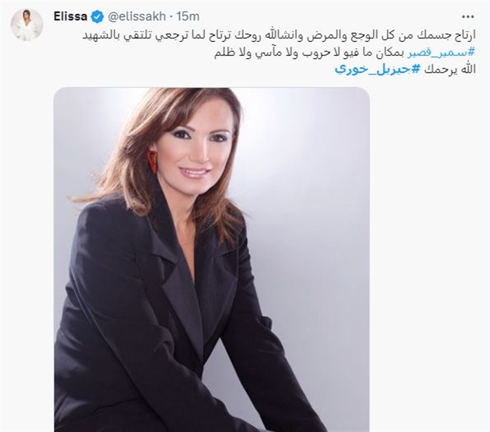 وأيضًا نعت الفنانة إليسا الإعلامية جيزال خوري، قائلة: ارتاح جسمك من كل الوجع والمرض وإن شاء الله روحك ترتاح لما ترجعي تلتقي بالشهيد سمير قصير بمكان ما فيه لا حروب ولا مآسي لا ظلم، الله يرحمك.