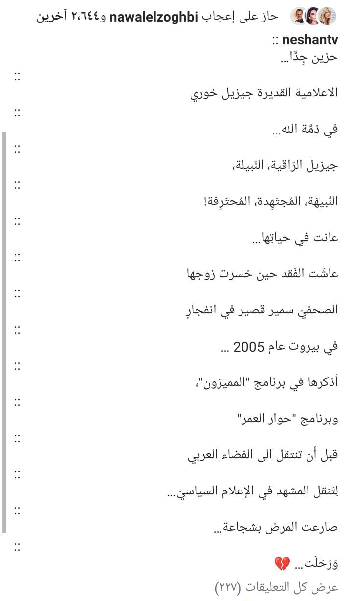 وعّبر الإعلامي نيشان عن حزنه الشديد لفقدان الإعلامية جيزال خوري، عبر حسابه الشخصي بموقع انستجرام، حيث كتب: حزين جدًا الإعلامية جيزال خوري في ذمة الله، جيزيل الراقية والنبيلة والنبيهة المجتهدة والمحترفة.