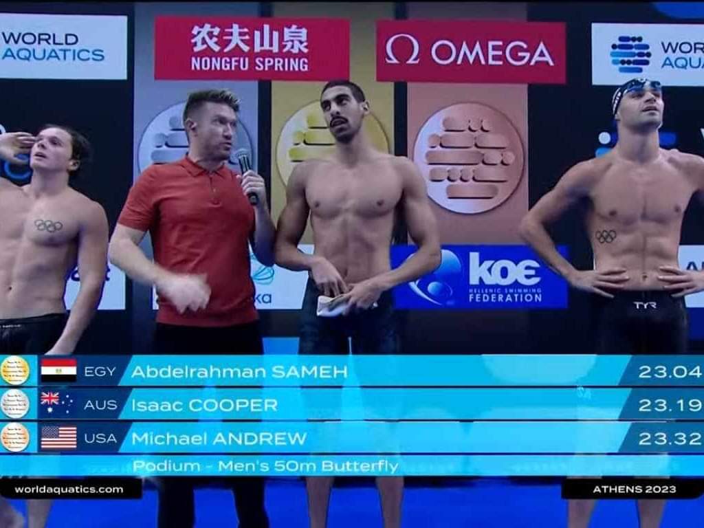 وفاز عبد الرحمن سامح بالميدالية الذهبية في سباق 50م فراشة بزمن 23:04 ثانية في إنجاز تاريخي، متفوقًا على عمالقة السباحة العالمية وأبطال أمريكا وأستراليا ويتوج بطلًا لكأس العالم للسباحة.