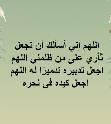 - اللهم يا ذا الجلال والإكرام، يا ذا الكبرياء والعظمة، يا من لا يُذل من نصرته، ولا يُخيب من توكل عليه، يا من هو حسبنا ونعم الوكيل، نسألك يا الله يا رب العالمين أن تنصرنا على من ظلمنا، وأن تكشف عنا كربة الظلم، وأن تجعل كيد الظالم في نحره، وأن ترد عليه ظلمه في نفسه وماله وأهله، وأن تجعله عبرة لمن يعتبر، وأن ترفع شأننا في الدنيا والآخرة.