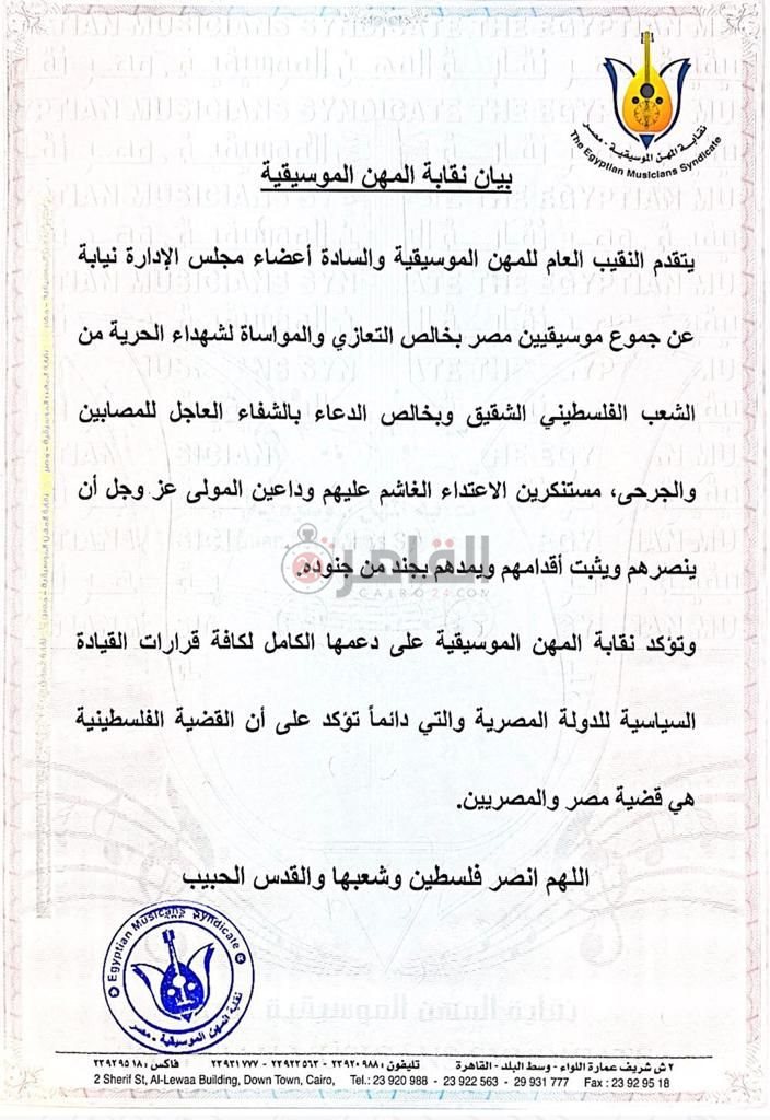 ونص بيان نقابة المهن الموسيقية على الآتي: يتقدم النقيب العام للمهن الموسيقية والسادة أعضاء مجلس الإدارة نيابة عن جموع موسيقيين مصر بخالص التعازي والمواساة لشهداء الحرية من الشعب الفلسطيني الشقيق وبخالص الدعاء الغاشم عليهم وداعين المولى عز وجل أن ينصرهم ويثبت أقدامهم ويمدهم بجند من جنوده.