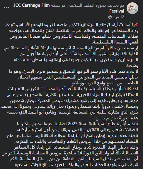 ونشر الحساب الرسمي لمهرجان أيام قرطاج السينمائية، بيانا جاء فيه: تأسست أيام قرطاج السينمائية لتكون منصة فكر ومقاومة بالأساس، تجمع رواد السينما من إفريقيا والعالم العربي للانتصار للفنّ وللجمال في مواجهة فظاعة السياسات القمعية، ولمناقشة الأفلام ومن خلالها قضايا العالم ومن أهمها القضية الفلسطينية.