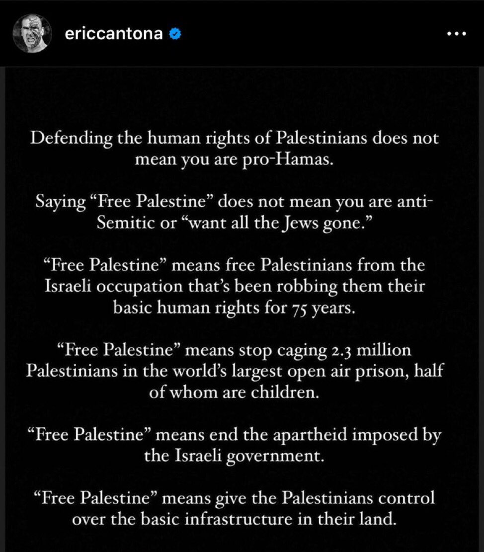 ونشر إريك كانتونا بيانًا عبر خاصية " الأستوري " على منصة انستجرام، وجاء كالتالي: إن الدفاع عن حقوق الإنسان للفلسطينيي لا يعني أنك مؤيد لحماس، إن قول " فلسطين حرة " لا يعني أنك معاد للسامية أو تريد رحيل جميع اليهود.