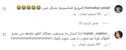 وجاءت التعليقات على النحو التالي: الترويج للماسونية بشكل غبي، أنت إنسان ما بتستحي على حالك.. الغو متابعة من عنده.. أطفال غزة عم تموت يا عيب الشوم عليك.