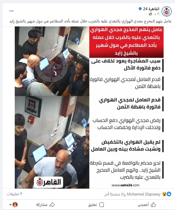 وفي سياق متصل، تواصل القاهرة 24 مع أحد العاملين بالمطعم لكشف ملابسات الواقعة، وكشف أحد شهود العيان تفاصيل اعتداء المخرج مجدي الهواري، حيث قال إن المخرج دخل المطعم وبصحبته 4 أشخاص من بينهم أبنائه، وطلبوا أطباق اللحم البقري ومشروب الواين، وأن هناك حوارًا ساخنا جرى بين الهواري ومن يجلسون معه جعله في حالة عصبية شديدة، وتعالت أصواتهم ثم نهض من جلسته وطلب الشيك، وخلال مراجعته وجده بقيمة 4600 جنيه فاعترض على قيمته الباهظة.