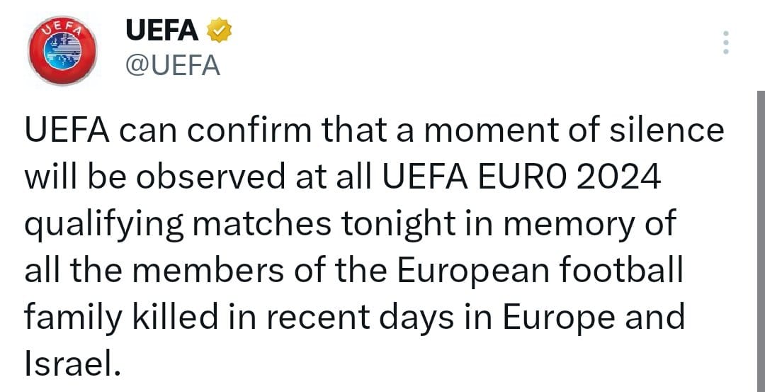 أعلن الاتحاد الأوروبي لكرة القدم يويفا في بيان رسمي عبر حسابه الرسمي على موقع التواصل الاجتماعي تويتر، أن هناك دقيقة صمت في مباريات اليوم بتصفيات اليورو المؤهلة لبطولة كأس الأمم الأوروبية يورو 2024.