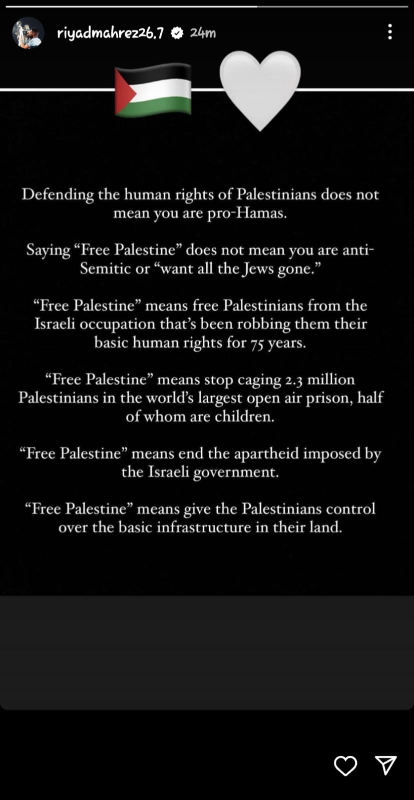 وكتب رياض محرز عبر ستوري في حسابه بإنستجرام في رسالة جاءت باللغة الإنجليزية: الدفاع عن حقوق الإنسان لأجل الفلسطينيين لا يعني أنك مؤيد لحماس، قولك فلسطين حرة لا يعني أنك ضد السامية أو تريد رحيل جميع اليهود.