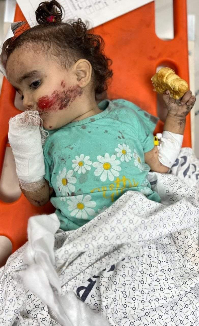 بابتسامة لم تدم لثوانٍ، سرقها صاروخٍ غاشم، رقدت الطفلة سوار، حاضنة لقمتها، قابضة على مصروفها المغموس بالدماء، ذراعها مشدودة بضمادة، ووجها مجزوعٌ، والجروح القديمة منتشرة في أماكن متفرقة بجسدها، وبعينين كبرتا قبل بلوغها العامين تراقب العالم المرير من حولها، الأشلاء مبعثرة والهواء برائحة الدماء، والجثث منتشرة على الأرض، فيما يتلقى العلاج بجوارها أطفال وكبار وسيدات.