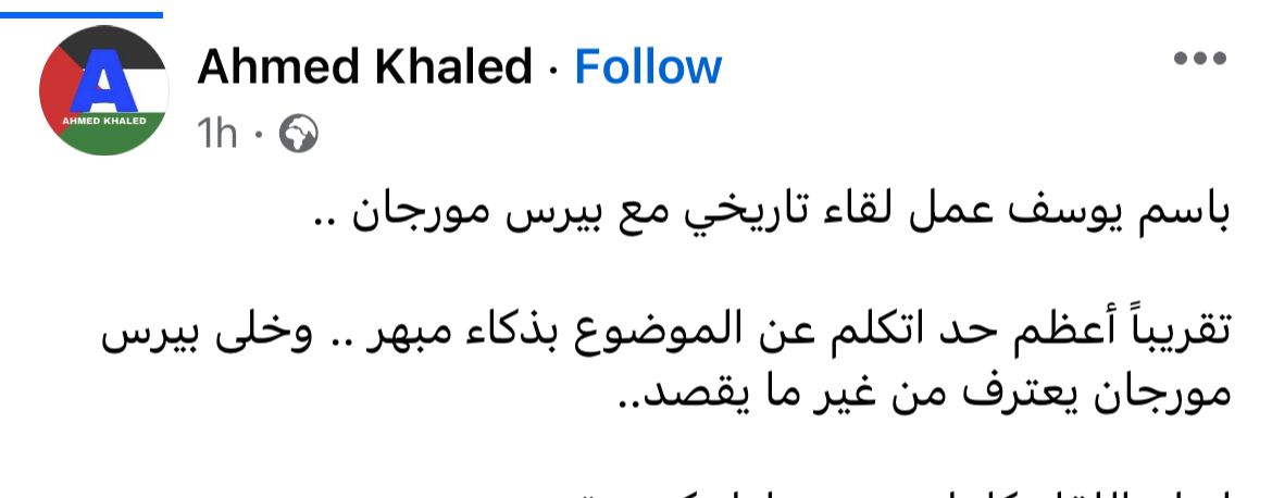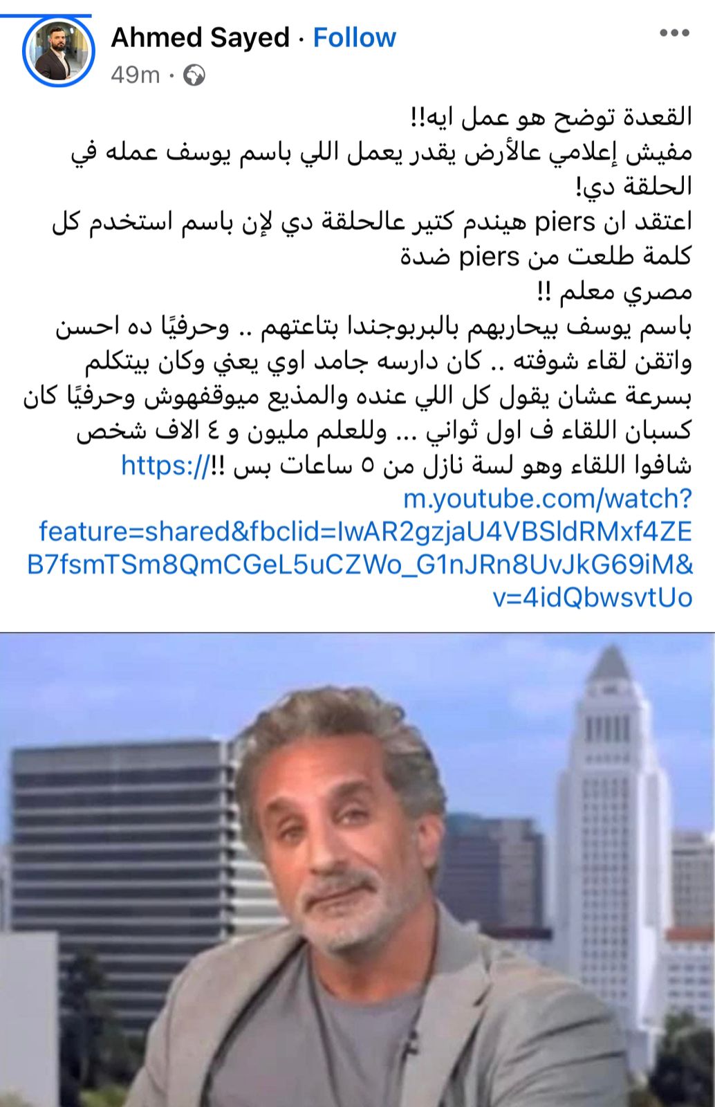 أثار باسم يوسف ضجة كبيرة على مواقع التواصل الاجتماعي، وحصد على دعم وتقدير كبير بين رواد السوشيال ميديا بعد لقائه الذي وصفوه بـ المرعب مع بيرس مورغان، الذي أدان وهاجم فيها إسرائيل.