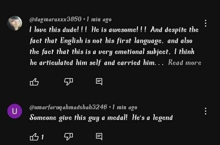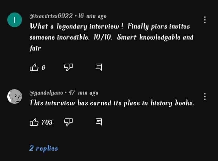 وجاء تعليق آخر: مقابلة باسم يوسف مع بيرس مورجان، رد فيها بشكل جذاب وساخر على كل الأكاذيب اللي بيتم نشرها، ومن أكتر من زاوية، عرض رأيه ثم تبنى رواياتهم ورد عليها بأسلوب ساخر وضّح بيه مدى هشاشتها، وفي التعليقات مئات الأجانب من مختلف الدول بيعترفوا إنهم اتضح لهم أشياء مكانوش يعرفوها عن حقيقة الصراع، لدرجة إن شخص كتب إنه عنده 84 سنة وفي حاجات بيعرفها لأول مرة.