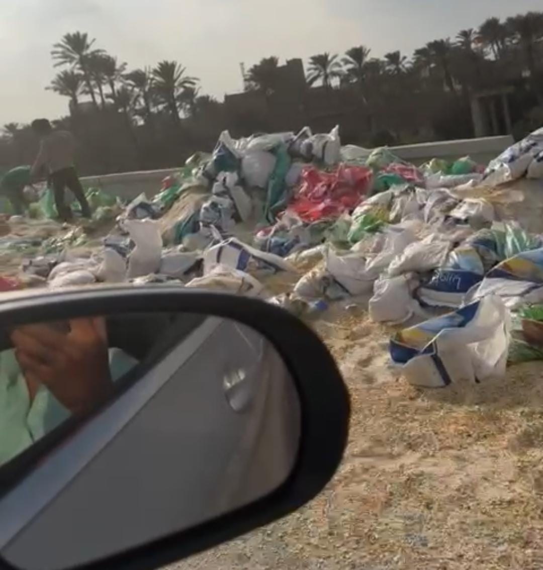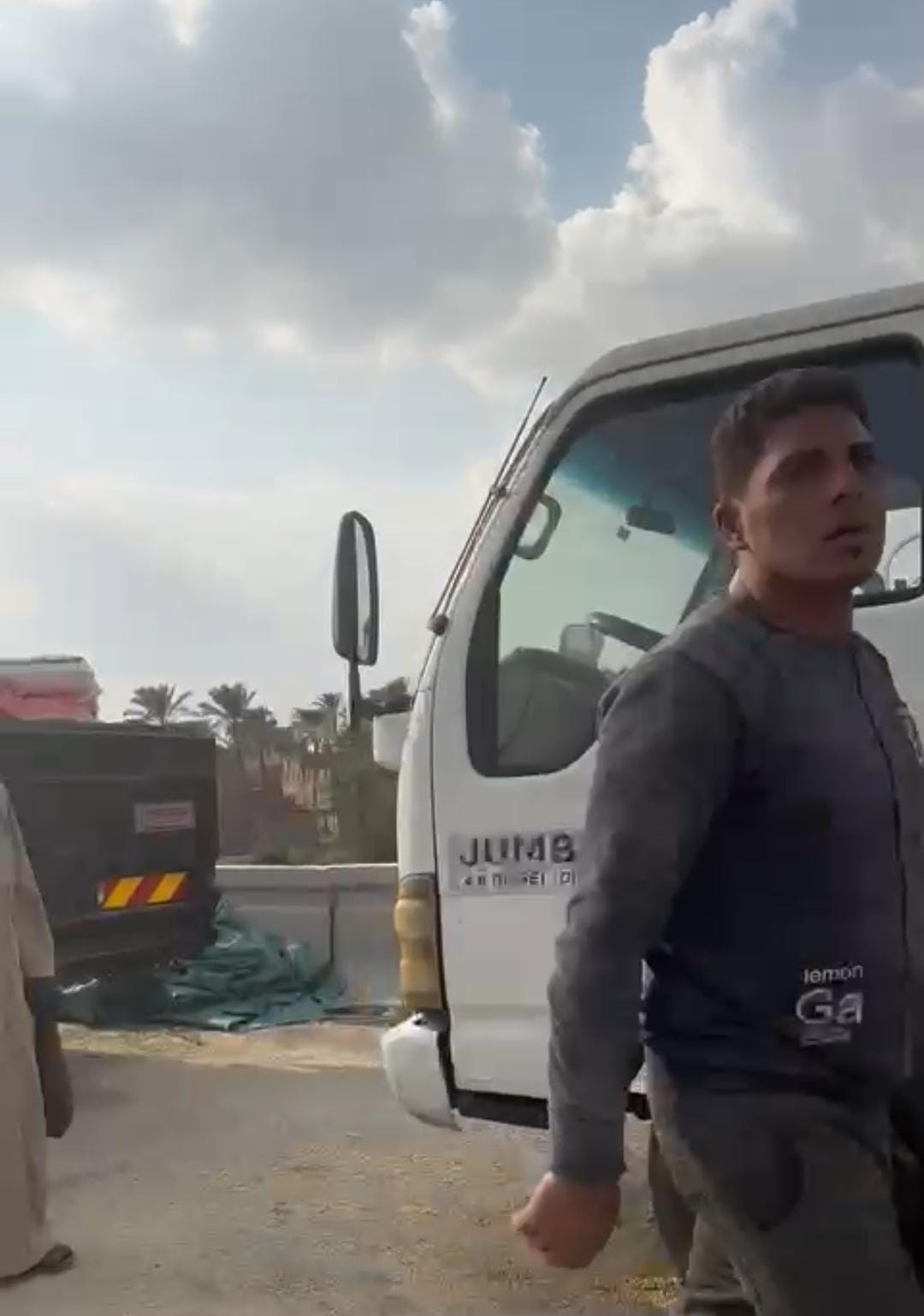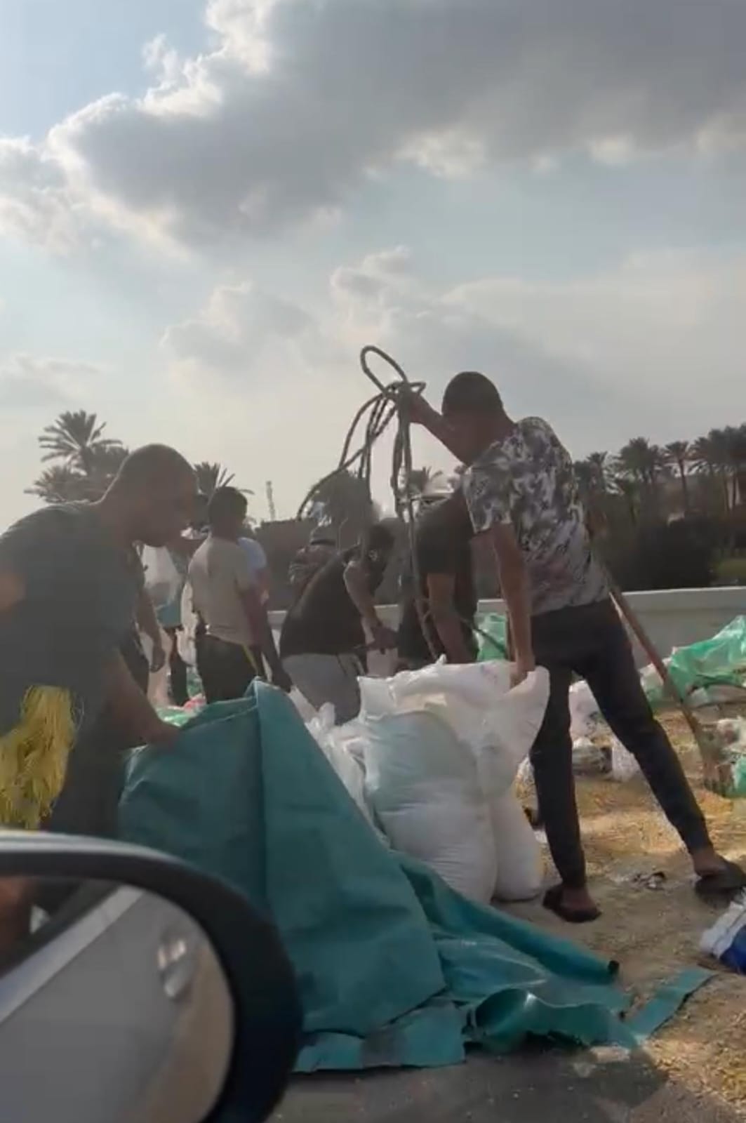 ورصدت عدسة القاهرة 24، عدة صور لحادث انقلاب سيارة النقل المحملة بالغلال، وأظهرت الصور تناثر جوالات الغلال على جانبي الطريق، ونزول قائدي السيارات لمحاولة للمساعدة في إزالة الغلال، وإعادة الحركة المرورية لطبيعتها مرة أخرى.