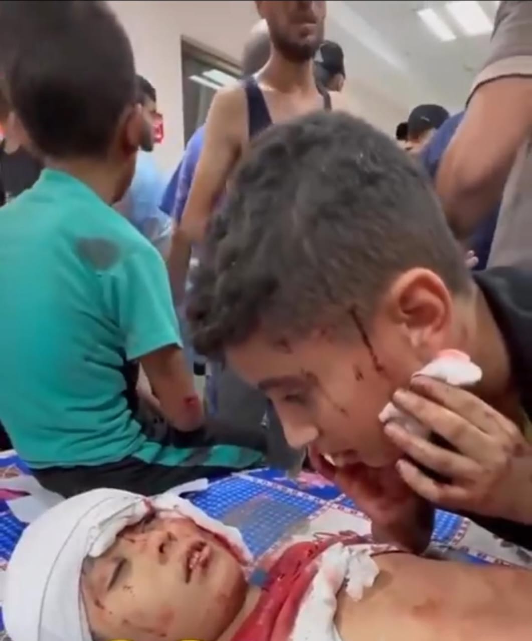 وفي فيديو آخر، ظهر 3 إخوة، من بينهم طفلان جريحان ينزفان دمًا، ويحاولان مواساة أخاهم الأصغر الذي يصارع الموت، فكان قد تمدد على إحدى الطاولات، نتيجة لإصابته بجروح خطيرة، فبدأ أخاه الأكبر يُقبل بطنه وينادي عليه قائلًا: سامعني؟ أحكي يارب، وارفع صوتك يا حبيبي، ليرد الطفل الذي يصارع الموت استجابة لمطلب، ليتابع الأخ الأكبر قائلًا: كلهم بخير، أنا معك.