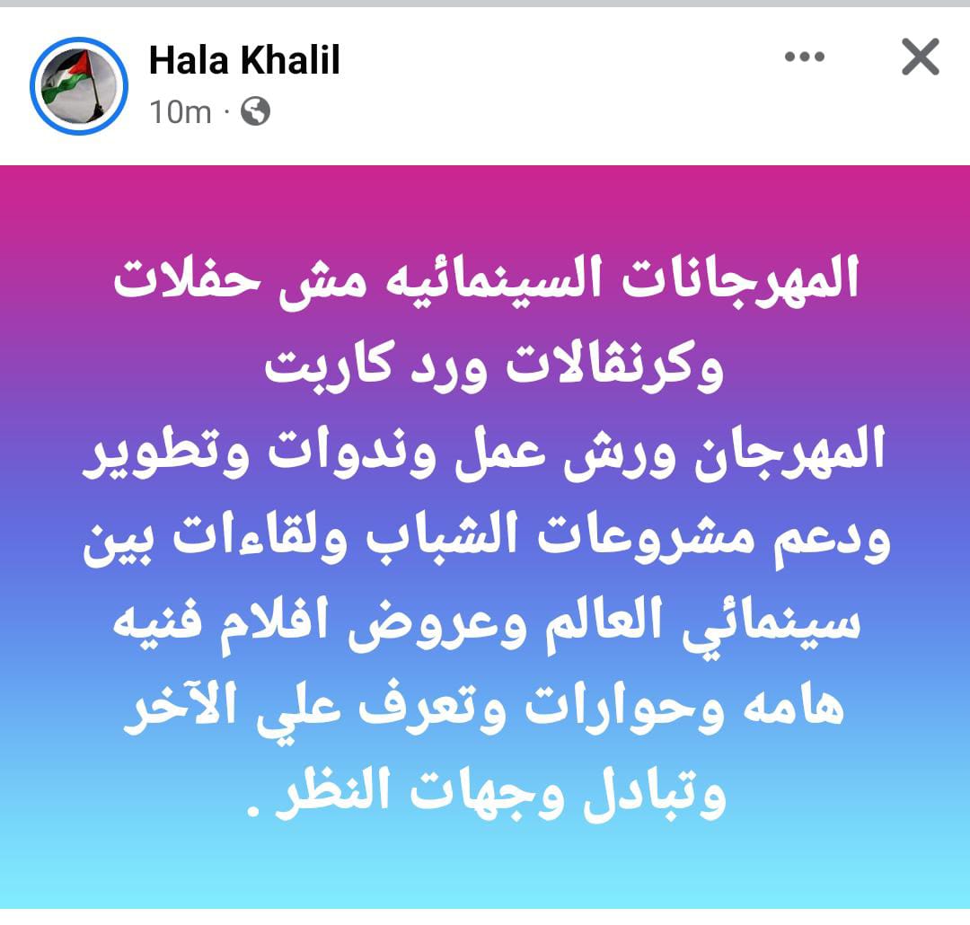 وكتبت هالة خليل، عبر حسابها الشخصي بموقع إنستجرام: المهرجانات السينمائية مش حفلات وكرنڤالات ورِد كاربت، المهرجان ورش عمل وندوات وتطوير ودعم مشروعات الشباب ولقاءات بين سينمائيّ العالم وعروض أفلام فنية مهمة وحوارات وتعرف على الآخر وتبادل وجهات النظر.