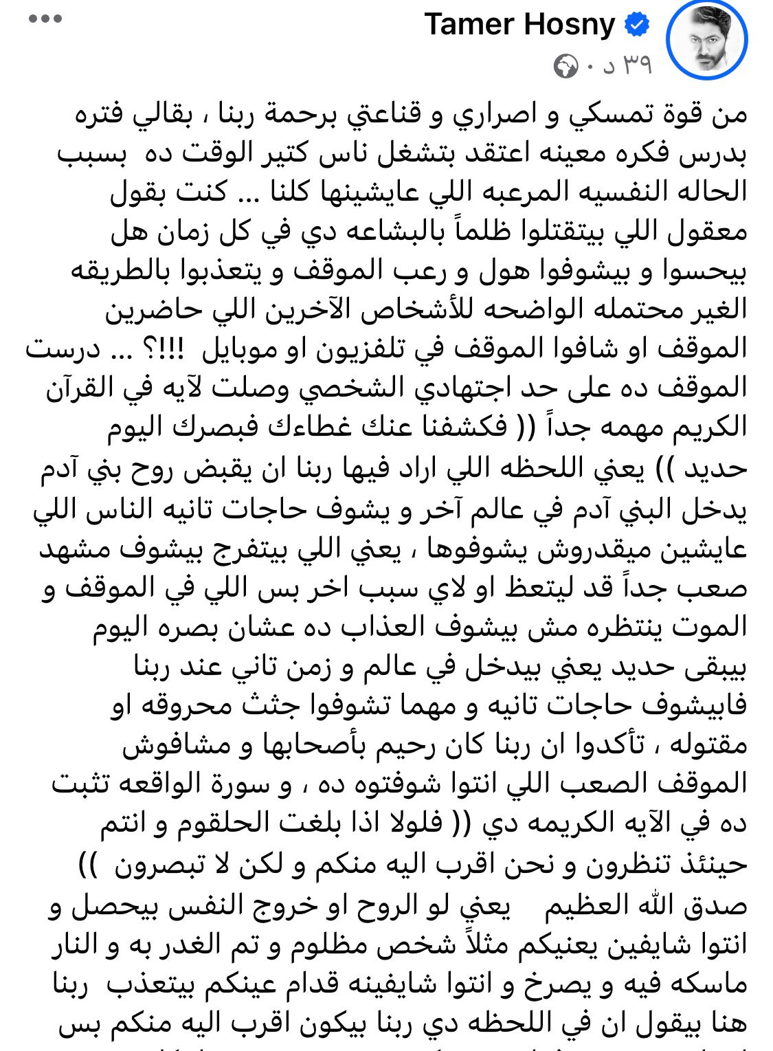 وكتب تامر حسني منشورًا عبر حسابه الشخصي بموقع فيسبوك، جاء فيه: من قوة تمسكي وعزيمتي وقناعتي برحمة الله قضيت فترة في دراسة فكرة معينة أعتقد أنها تشغل الكثير من الناس هذه المرة بسبب الحالة النفسية المرعبة التي نعيشها جميعا وكنت أقول إنه من المعقول بالنسبة لأولئك الذين يقتلون ظلمًا، هل يشعرون ويرون طوال الوقت فظاعة الموقف ويعانون بطريقة لا تطاق تكون واضحة لأشخاص آخرين كانوا حاضرين في الموقف أو شاهدوا الموقف على التليفزيون أو الهاتف المحمول، لقد درست هذا الموقف بناءً على مجهودي الشخصي وتوصلت إلى آية مهمة جدًا في القرآن الكريم.
