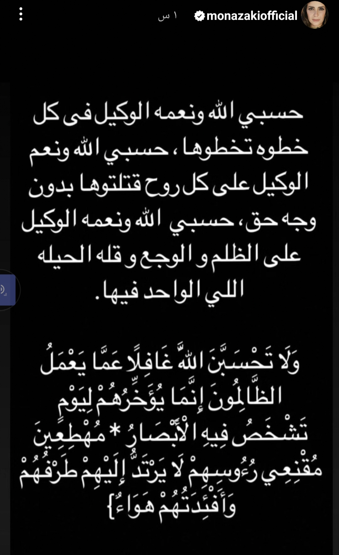 وكتبت منى زكي استوري، عبر حسابها الشخصي بموقع تبادل الصور والفيديوهات إنستجرام، تدعو فيه على العدو الإسرائيلي بعد قتل الأبرياء في غزة، إذ قالت: حسبي الله ونعم الوكيل في كل خطوة تخطوها، حسبي الله ونعم الوكيل على كل روح قتلتوها بدون وجه حق، حسبي الله ونعم الوكيل على الظلم والوجع وقله الحيلة اللي الواحد فيها.