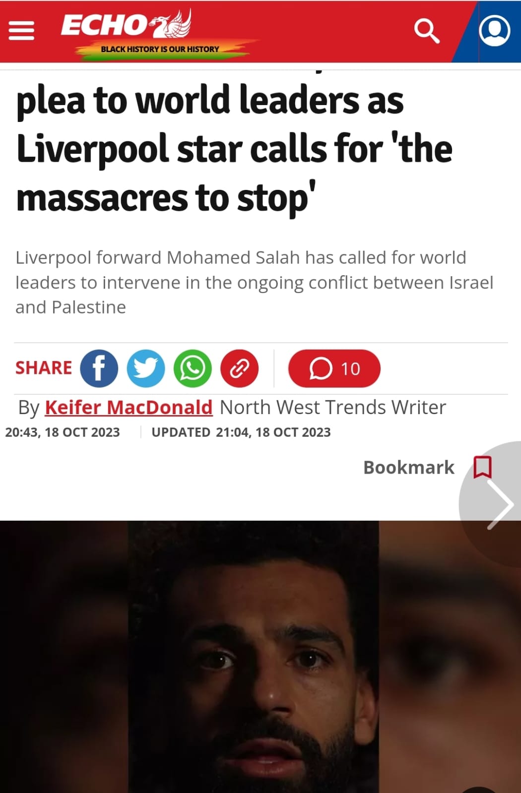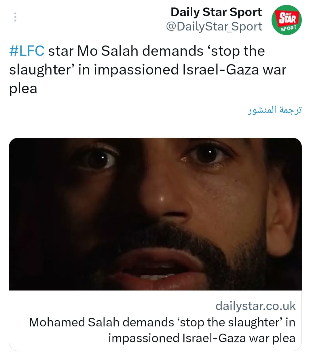 ونشرت صحيفة ليفربول إيكو الإنجليزية، خطاب لاعب منتخبنا الوطني محمد صلاح المحترف ضمن صفوف فريق ليفربول الإنجليزي لدعم فلسطين ومطالبته بوقف الحرب، وأن سكان غزة حاليا يحتاجون إلى الغذاء والماء والدواء فورًا.