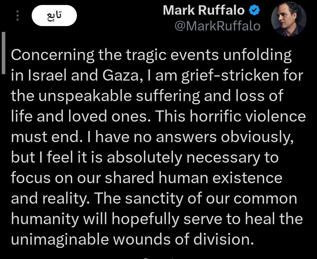 يعد النجم الأمريكي مارك رافللو من أوائل الداعمين للقضية الفلسطينية، حيث ندد بهجمات الاحتلال الإسرائيلي ضد المدنيين والأطفال في غزة.