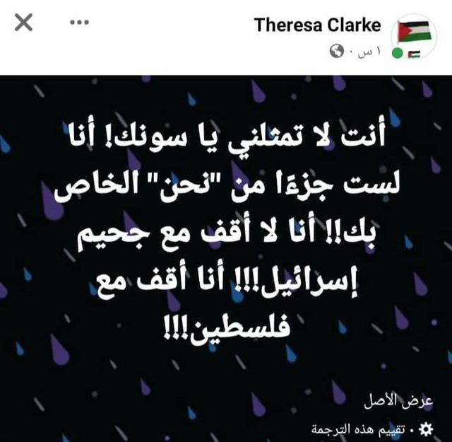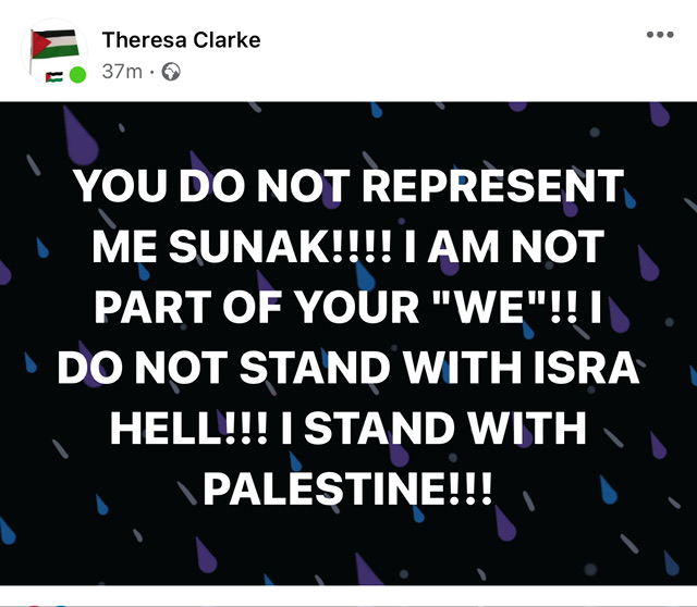 وقالت تريزا وباربرا في منشورات عبر صفحاتهما على موقع التواصل الاجتماعي فيسبوك من الأقصر: أنت لا تمثلنا كبريطانيتين يا سوناك ولست جزئا منا أنت تدعم الجحيم المتمثل في إسرائيل ونحن ندعم فلسطين.