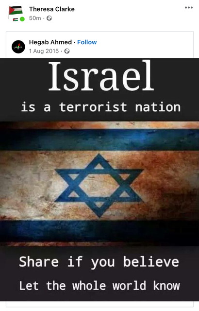 ونشرت تريزا صورا على صفحتها تنتقد فيها محطة BBC البريطانية الشهيرة وتناولها ونشرها الأكاذيب لصالح إسرائيل، وقالت إن عليهم أن يشعروا بالخجل والعار وأن يتجرعوه.