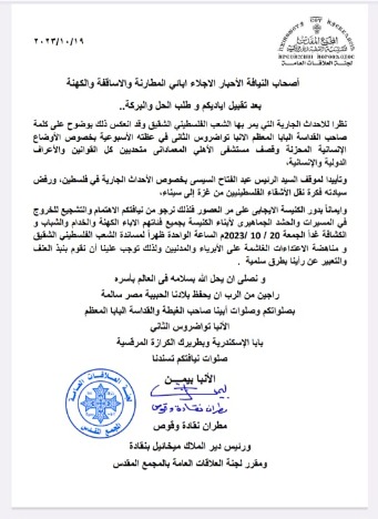 وجاء بيان لجنة العلاقات العامة بالمجمع المقدس كالتالي: نظرًا للأحداث الجارية التي يمر بها الشعب الفلسطيني الشقيق، وقد انعكس ذلك بوضوح على كلمة صاحب القداسة البابا المعظم الأنبا تواضروس الثاني في عظته الأسبوعية بخصوص الأوضاع الإنسانية المحزنة وقصف مستشفى الأهلي المعمداني متحديين كل القوانين والأعراف الدولية والإنسانية وتأييدا لموقف الرئيس عبد الفتاح السيسي بخصوص الأحداث الجارية في فلسطين، ورفض فكرة نقل الأشقاء الفلسطينيين من غزة إلى سيناء، وإيمانًا بدور الكنيسة الإيجابي على مر العصور.. نرجو من نيافتكم الاهتمام والتشجيع للخروج في المسيرات والحشد الجماهيري لأبناء الكنيسة بجميع فئاتها، الآباء الكهنة والخدام والشباب والكشافة، غدًا الجمعة 20 / 10 /2023م الساعة الواحدة ظهرًا؛ لمساندة الشعب الفلسطيني الشقيق ومناهضة الاعتداءات الغاشمة على الأبرياء والمدنيين، لذلك توجب علينا أن ننبذ العنف ونعبر عن رأينا بطرق سلمية ونصلي أن يحل الله بسلامه في العالم بأسره.