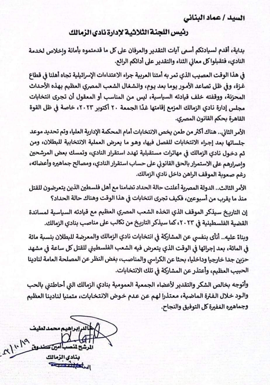 واختتم بيانه: وبناء عليه.. أنأى بنفسي عن المشاركة في انتخابات نادي الزمالك والمعرضة للبطلان بنسبة مائة في المائة، بعد إجرائها في الوقت الذي يتعرض فيه الشعب الفلسطيني للقتل كل ساعة في مشهد حزين جدا خارجيا وداخليا بحثا عن الكراسي والمناصب، بغض النظر عن المصلحة العامة لنادينا الحبيب العظيم، وأعتذر عن المشاركة في تلك الانتخابات.