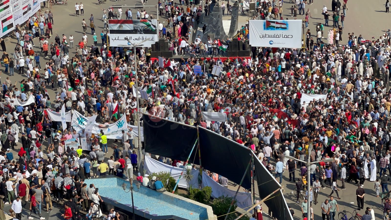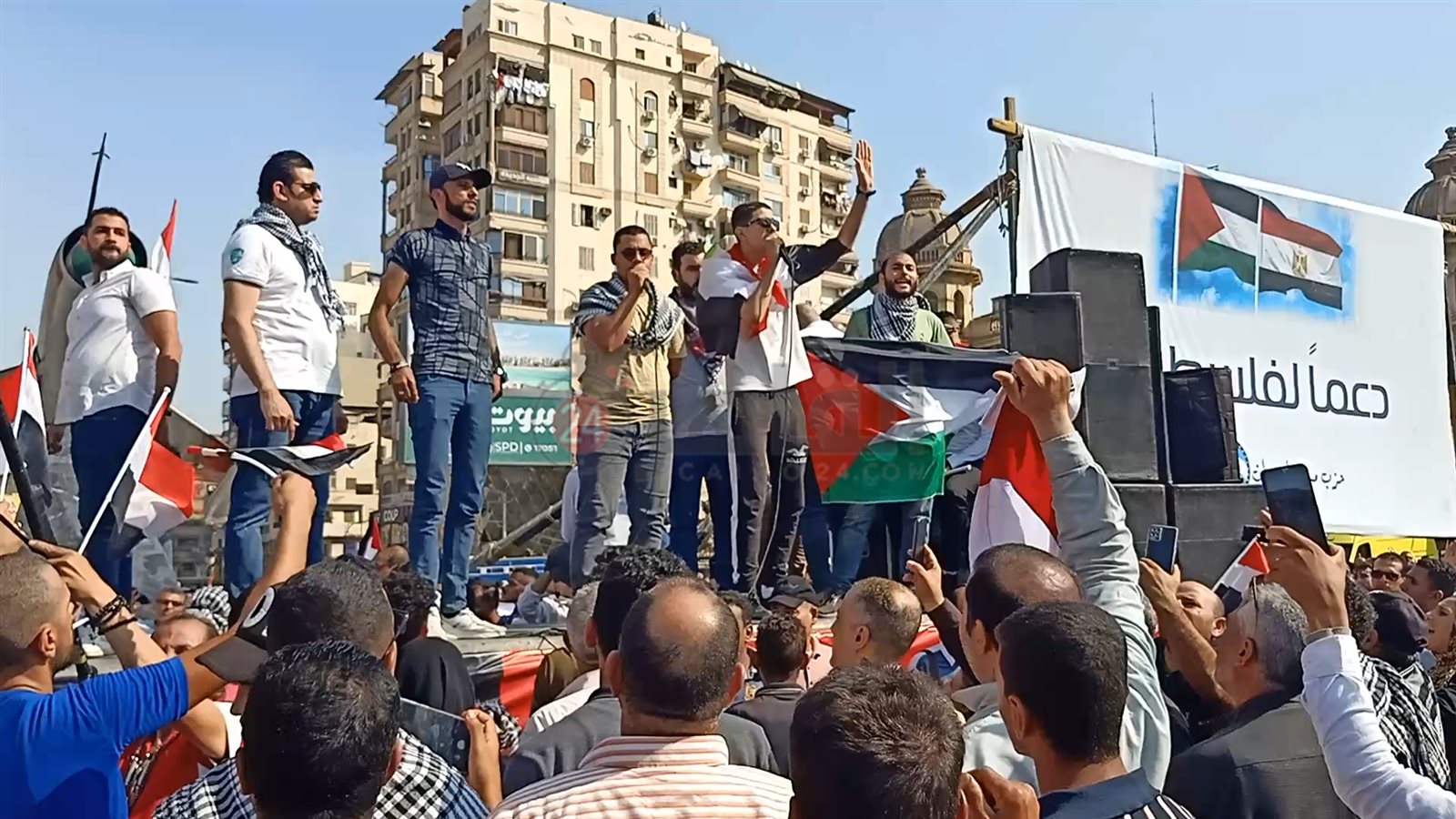 واحتشد المواطنون في الميدان رافعين العلمين المصري والفلسطيني، ومرددين هتافات مناهضة لجيش الاحتلال ومساندة للقضية الفلسطينية، منها: لبيك يا أقصى، وبالروح بالدم نفديك يا أقصى، والشعب يريد تحرير فلسطين.
