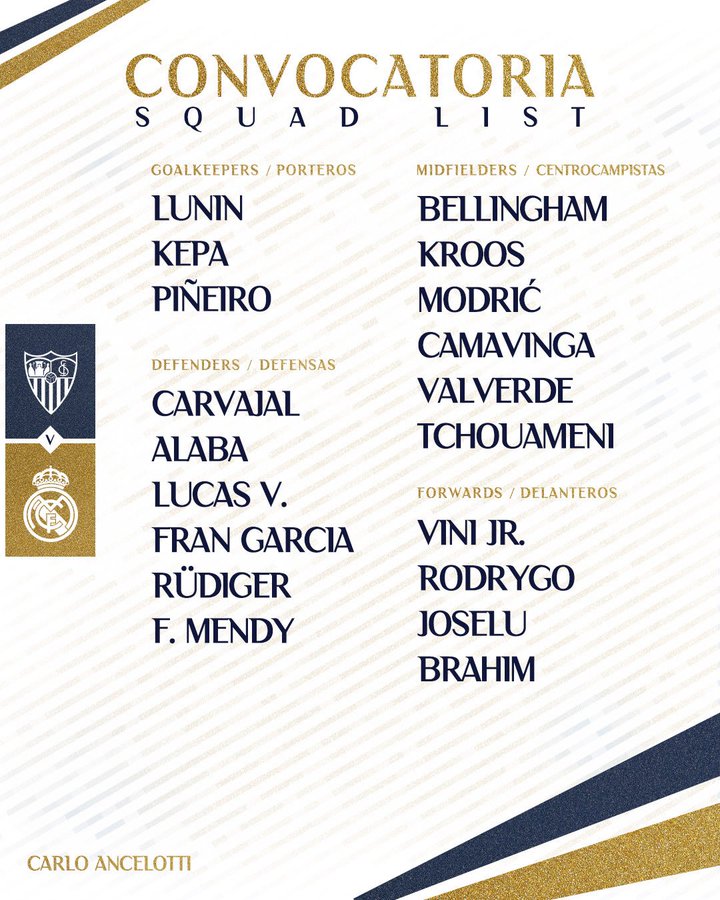 أعلن الإيطالي كارلو أنشيلوتي المدير الفني لفريق ريال مدريد، قائمة الميرنجي لخوض مواجهته المرتقبة أمام إشبيلية التي تجمع بينهما ضمن منافسات مسابقة الدوري الإسباني.