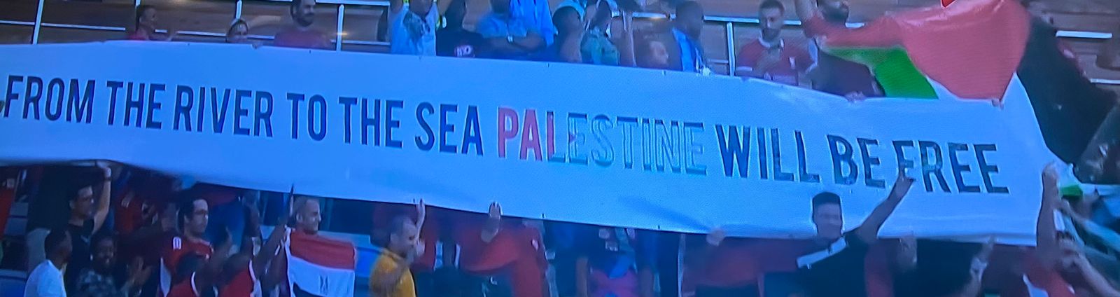 ونزل لاعبو الفريق الأول لكرة القدم بالنادي الأهلي، إلى أرضية ستاد بنجامين مكابا، في الوقت الذي حرص فيه جمهور الفريق الموجود في المباراة على رفع لافتة لدعم أهل فلسطين مكتوب عليها: من النهر إلى البحر فلسطين ستظل حرة.