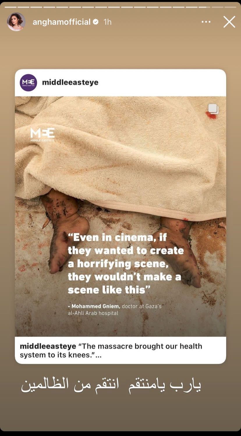 نشرت الفنانة أنغام صورة من مشاهد قتل أطفال غزة، معربة عن استيائها الشديد من قتل الأطفال الأبرياء واستباحة دمائهم من قبل العدو الإسرائيلي، وكتبت أنغام عبر ستوري حسابها الخاص بموقع انستجرام: يا رب يا منتقم انتقم من الظالمين.
