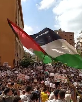 وردد الطلاب المشاركين في الوقفة الاحتجاجية الكثير من الهتافات لدعم أهالي غزة ورفع علم فلسطين من ضمنها: فلسطين عربية، أنا دمي فلسطيني