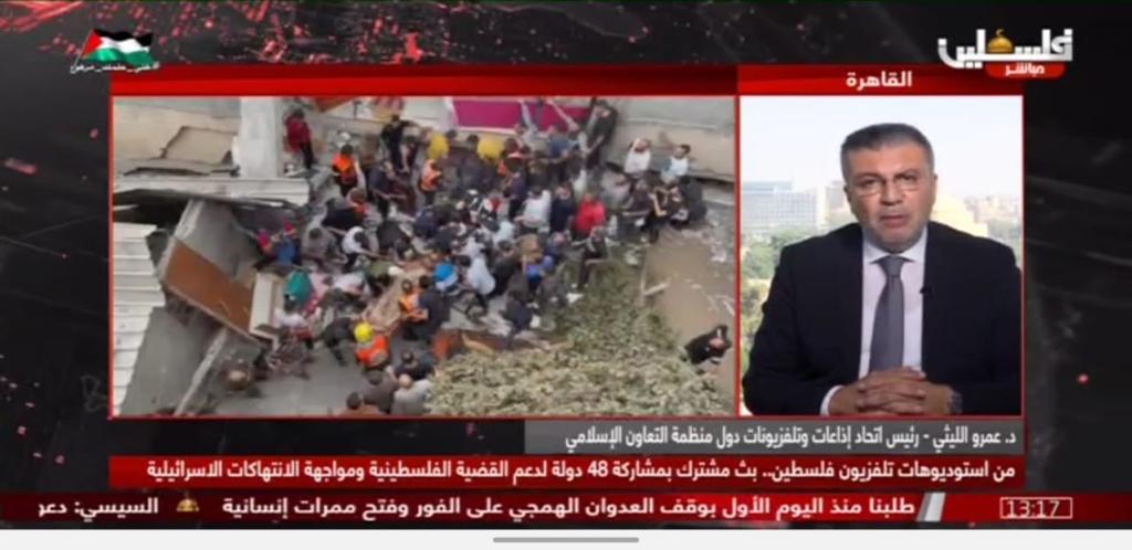 وشدد الليثي: من يعتقد أنه ممكن أن يغير الحقائق أو يمحو الحقائق أو أن يحول الأكاذيب إلى حقيقة ويتم تزييف التاريخ، فهم الذين قتلوا الأطفال بدون وازع من ضمير أو شفقة أو رحمة، وسوف تلاعنهم جميعا لعنات هؤلاء الشهداء حتى وهم في قبورهم، سوف تلاحقهم وتلعنهم وسوف يسجلون هؤلاء المجرمين اسمهم في سجلات الدم والعار في تاريخ الحياة والحضارة الإنسانية، أما نحن كإعلاميين وكاتحاد إذاعات وتلفزيونات دول منظمه التعاون الإسلامي هذا هو دورنا حقيقي الدفاع عن هذه القضية، والدفاع عن مقدساتنا التي نعيش من أجلها وندافع عنها ونبذل كل غالي ونفيس في سبيل الدفاع عنها وحمايتها، وأن كل إعلامي يجب أن نوفر له الحماية الكاملة وإذا كانت إسرائيل تعتقد أنها بقتل الصحفيين والإعلاميين فإنها بذلك تقوم بطمس الحقائق فهي واهمة.