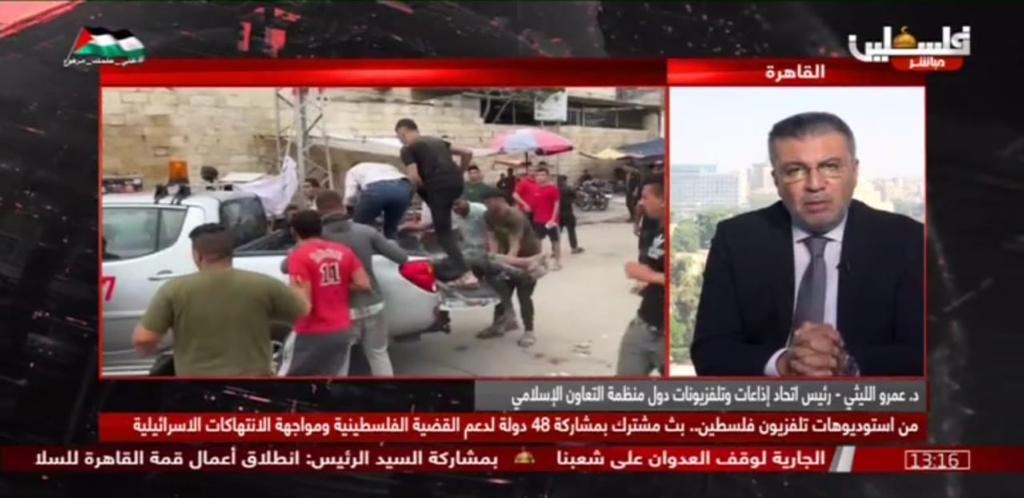 وتابع الليثي: إنني أتوجه بخالص الشكر والتقدير لجميع الدول المشاركة في البث المشترك مع التليفزيون الفلسطيني والتي وصل عددها إلى 49 دولة، والشكر موصول إلى جميع الإذاعات والتليفزيونات، وإلى الاتحاد الأوروبي وسبوتنيك الروسية، والجميع يقف بصورة واضحة مع فلسطين ونحن نقوم بدورنا في التغطية الإعلامية، وكل إعلامي يضع كفنه على يده، ونطالب الإعلام الغربي بأن يكون محايدا وأن يحترم جميع المواثيق الدولية وضرورة الحفاظ على أرواح الإعلاميين.
