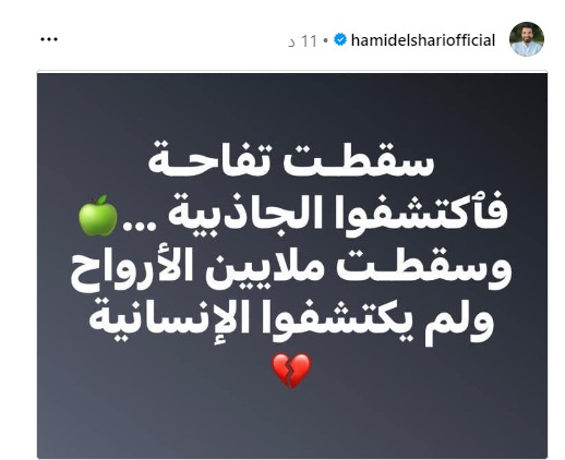 وكتب حميد الشاعري منشورًا عبر حسابه الشخصي بموقع فيسبوك، جاء فيه: سقطت تفاحة فاكتشفوا الجاذبية وسقطت ملايين الأرواح ولم يكتشفوا الإنسانية.