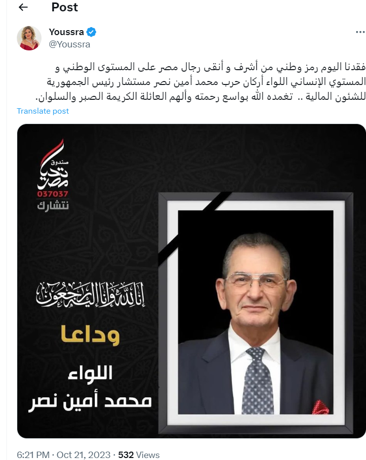 وكتبت يسرا عبر حسابها بموقع التدوينات القصيرة تويتر: فقدنا اليوم رمز وطني من أشرف وأنقى رجال مصر على المستوى الوطني والمستوى الإنساني اللواء أركان حرب محمد أمين نصر مستشار رئيس الجمهورية للشئون المالية.. تغمده الله بواسع رحمته وألهم العائلة الكريمة الصبر والسلوان.