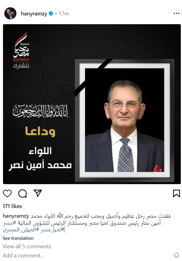حرصت الفنانة يسرا على نعي اللواء أركان حرب محمد أمين نصر مستشار رئيس الجمهورية للشئون المالية، وأمين صندوق تحيا مصر، وأحد رموز مصر والمؤسسة العسكرية ورجالها المخلصين، الذي ودع عالمنا صباح اليوم.