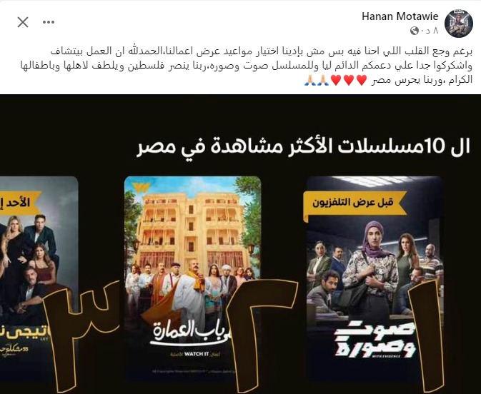 وكتبت حنان مطاوع منشورًا عبر حسابها الشخصي بموقع التواصل الاجتماعي فيس بوك، قالت فيه: برغم وجع القلب اللي إحنا فيه بس مش بإدينا اختيار مواعيد عرض أعمالنا، الحمد لله إن العمل بيتشاف، وأشكركوا جدًا على دعمكم الدائم ليا، وللمسلسل صوت وصورة، وربنا ينصر فلسطين ويلطف بأهلها وبأطفالها الكرام، وربنا يحرس مصر.
