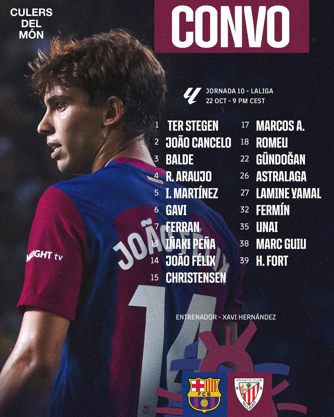 أعلن المدرب تشافي هيرنانديز، المدير الفني لفريق الكرة الأول بنادي برشلونة، قائمة الفريق التي تخوض مباراة أتلتيك بلباو، في الدوري الإسباني.