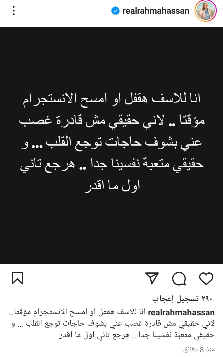 ونشرت رحمة حسن على حسابها الرسمي بـ انستجرام منشورًا، معلقه فيه: أنا للأسف هقفل وهمسح الانستجرام مؤقتا.. لأني حقيقي مش قادرة غصب عني بشوف حاجات توجع القلب وحقيقي متعبة نفسيا جدًا.. هرجع تاني أول ما أقدر.