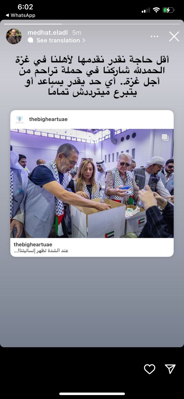 ونشر مدحت العدل صورة له عبر استوري انستجرام، وهو يساهم في تجهيز وإعداد المساعدات الغذائية لأهالي غزة مع تعليق: أقل حاجة نقدر نقدمها لأهلنا في غزة، الحمدلله شاركنا في حملة تراحم من أجل غزة.. أي حد يقدر يساعد أو يتبرع ميترددش تماما.