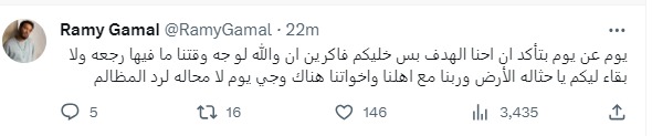 وكتب رامي جمال عبر حسابه بموقع التدوينات القصيرة X: يوم عن يوم بتأكد إن إحنا الهدف بس خليكم فاكرين إن والله لو جه وقتنا ما فيها رجعة، ولا بقاء ليكم يا حثالة الأرض، وربنا مع أهلنا وإخواتنا هناك، وجاي يوم لا محالة، لرد المظالم.