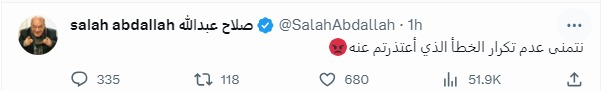 كما كتب صلاح عبد الله أيضا عبر حسابه بموقع التدوينات X: نتمنى عدم تكرار الخطأ الذي اعتذرتم عنه.
