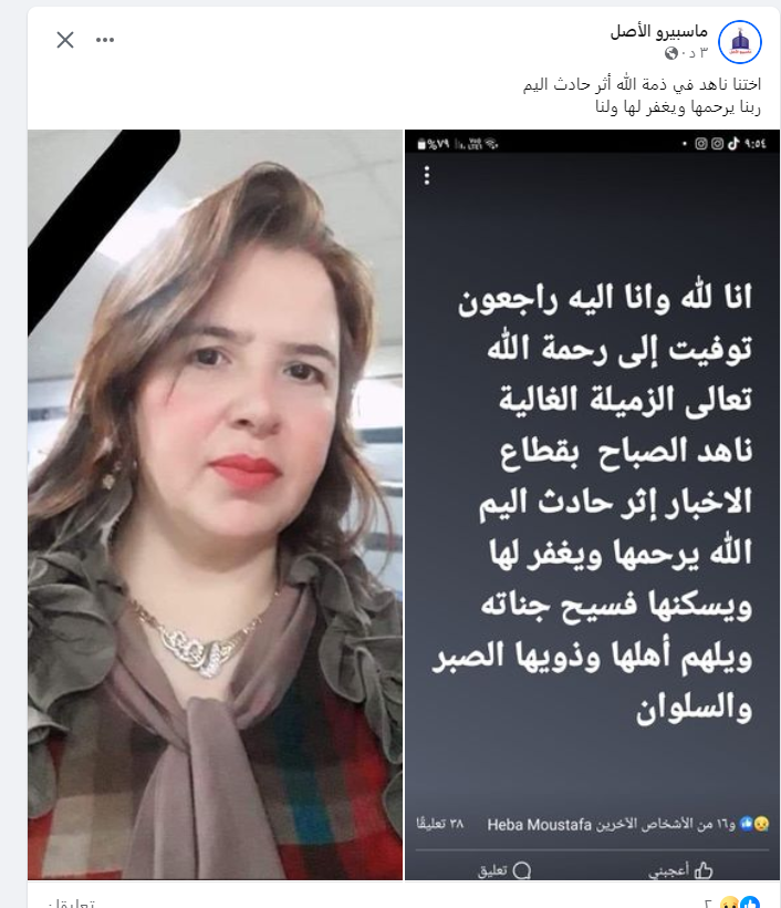 وكتبت سهير النرش: من لم يمت بالسيف مات بغيرِه، نشرت هذه الصورة ورحلت إثر حادث أليم الإعلامية المصرية ناهد الصباح زميلة عمر في ماسبيرو، الله يرحمها ويسكنها الجنة ويصبر أهلها.