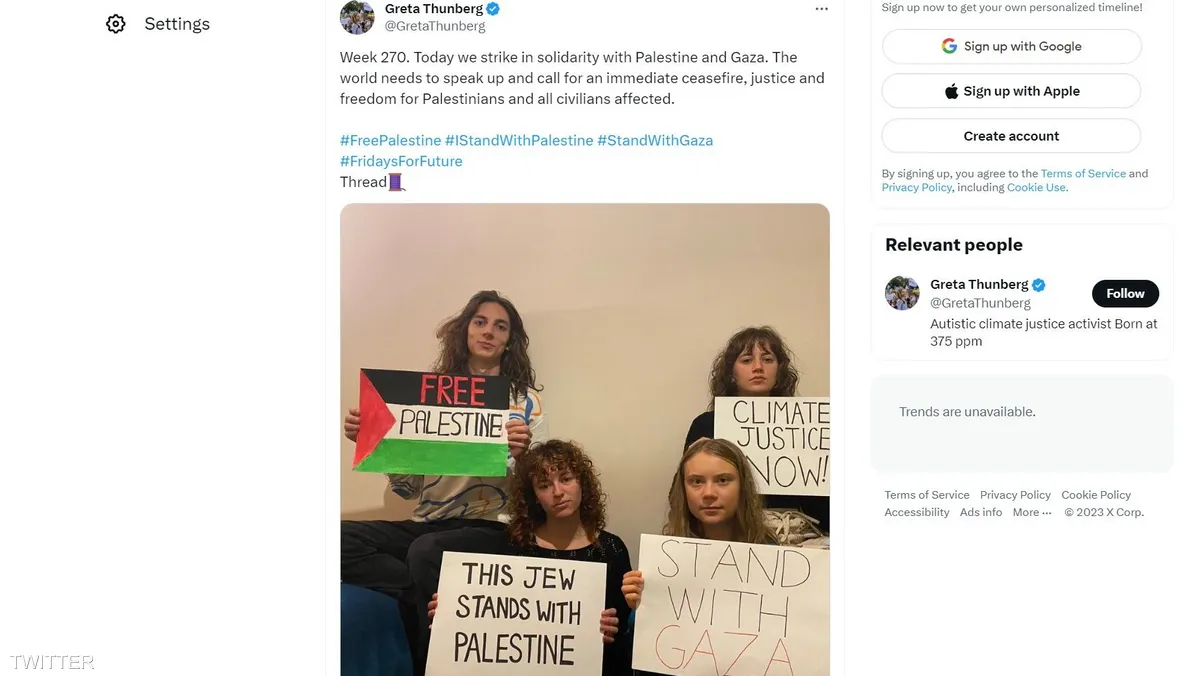 وظهرت غريتا مع 3 فتيات في الصورة يحملن لافتات كتب عليها "ادعم غزة" و"فلسطين حرة"، و"هذه اليهودية تدعم فلسطين" و"العدالة المناخية".