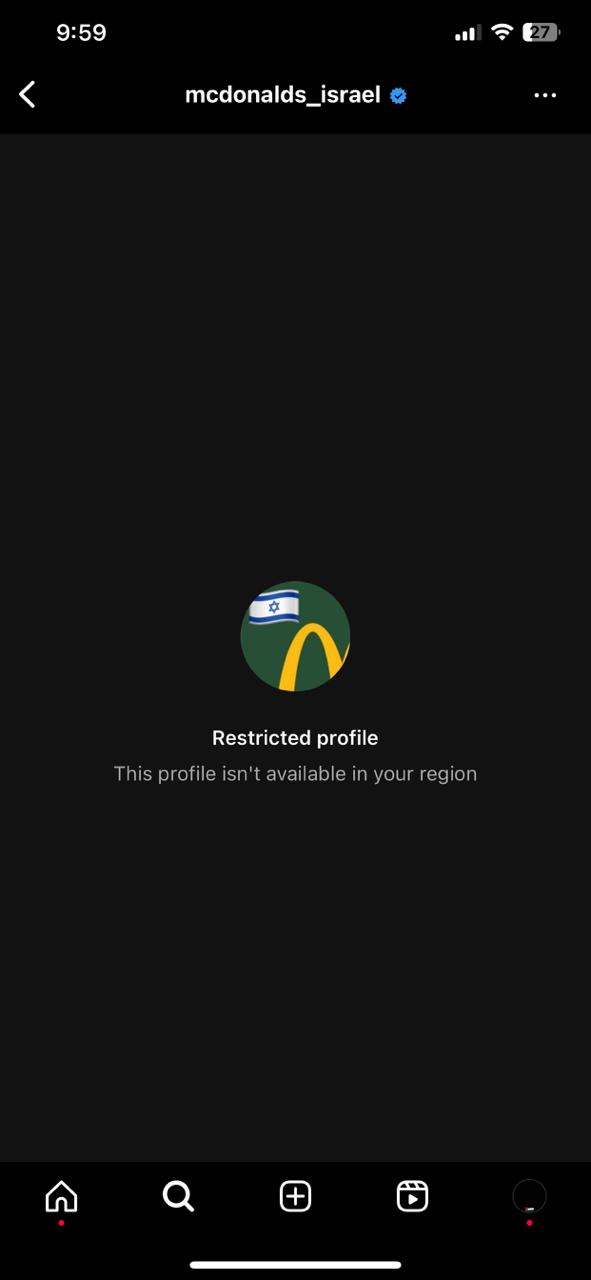 ويظهر للمتصفحين عند الدخول على موقع انستجرام ومحاولة الوصول إلى صفحة ماكدونالدز إسرائيل، عبارة تنص على أن هذا الحساب غير متوافر في منطقتك.